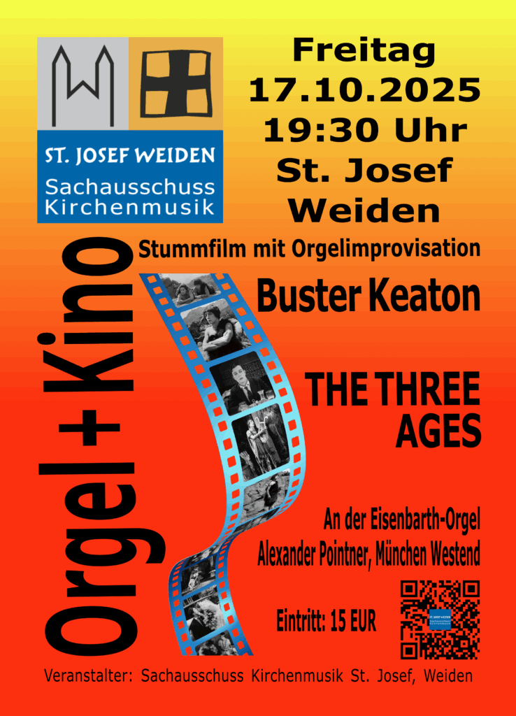 Am Freitag, 17. Oktober verwandelt sich die Weidener Josefskirche wieder einmal in einen Kinosaal der 1920er-Jahre. Auf der Großleinwand flimmert Buster Keatons erster abendfüllender Spielfilm „The Three Ages“ / „Die drei Zeitalter“ aus dem Jahr 1923. Keaton erzählt darin von der Liebe – urkomisch und wortlos – in drei Epochen: von der Steinzeit über das alte Rom bis in die wilden Zwanziger.
